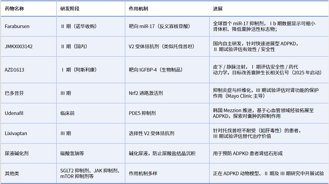 微小RNA靶向药物(Farabursen):反义寡核苷酸,靶向降解miR-17,解除对PKD1/PKD2等靶基因的抑制。