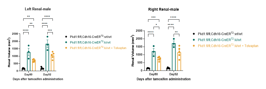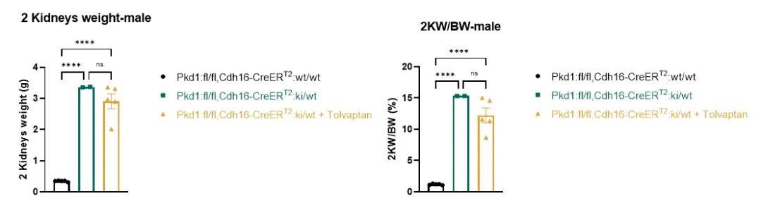 图4. 托伐普坦干预可显著缓解雄性ADPKD模型小鼠肾脏体积增大