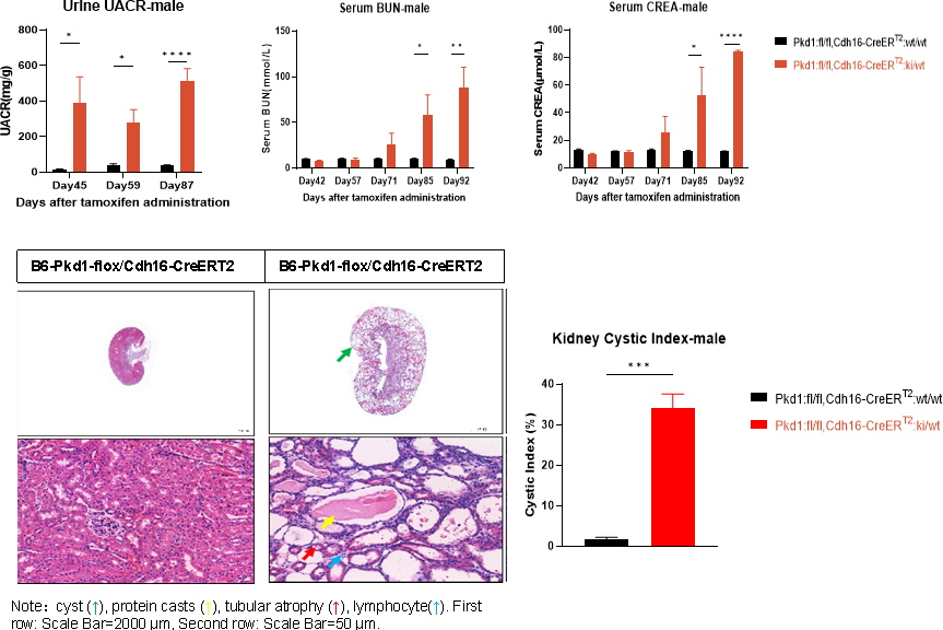 诱导后92天:肾脏出现多发性囊肿、蛋白管型、肾小管萎缩等病理表型,囊肿指数大幅增加,与人类ADPKD表型高度一致。