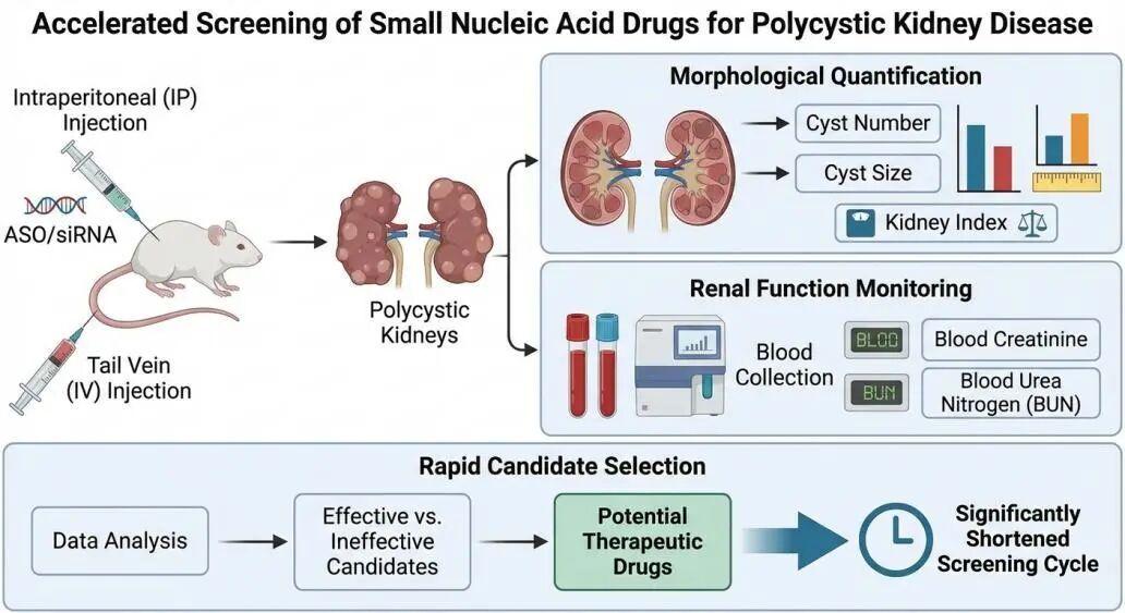 高通量筛选:通过腹腔或尾静脉注射给药,可量化检测囊肿数量、大小、肾脏指数及肾功能指标(血肌酐、血尿素氮),用于快速筛选候选分子。