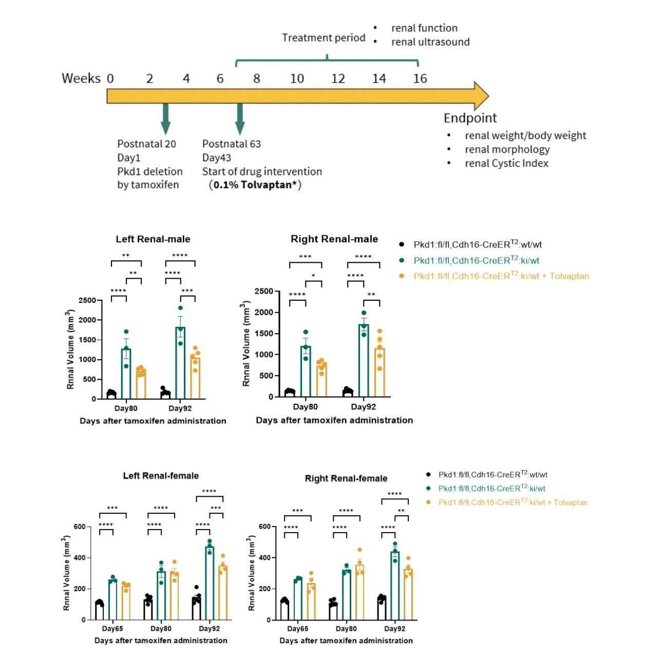 在该模型上,使用托伐普坦治疗后,疾病小鼠的肾脏肿胀显著减轻,疗效符合临床预期。